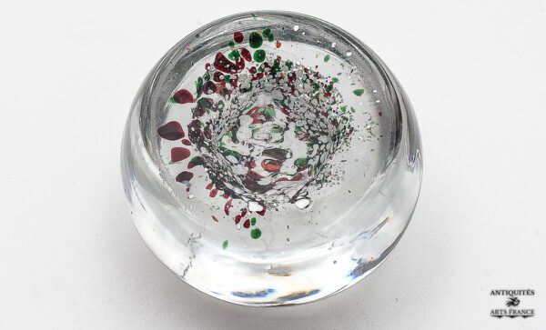 Vieux presse papier boule à inclusion de bonbons polychrome. Le verre a un effet « loupe ».